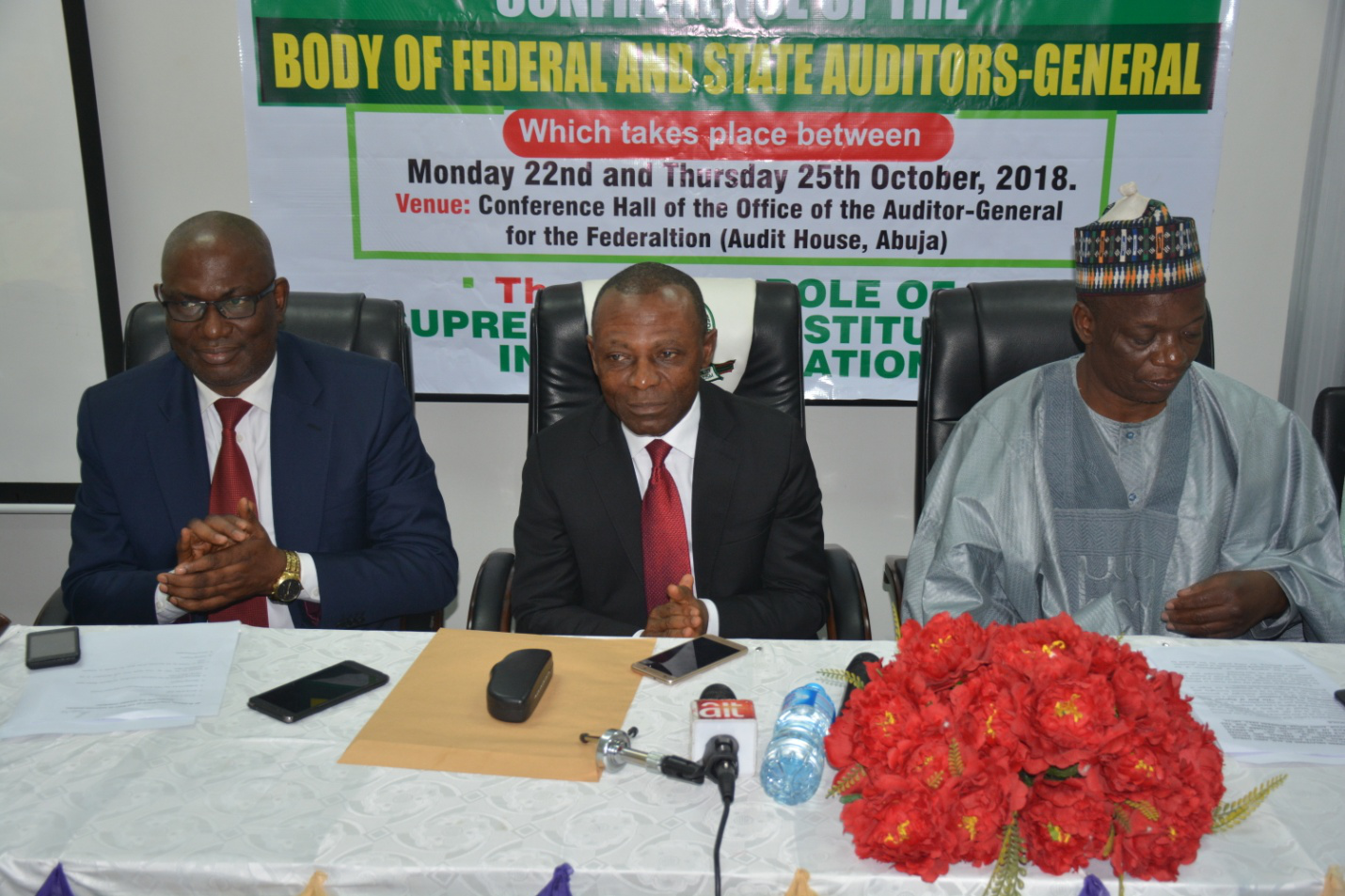 The Auditor-General for the Federation, Anthony Mkpe Ayine (Middle), Chairman of the body of state Auditors-General, Abdu Usman Aliyu (Right), and Former Chairman of the Body, Chris Nyong (Left), at the 48th Bi- Annual Conference of the body of Federal and State Auditors-General held on Tuesday, 23rd October, 2018, at the Audit House Abuja.
