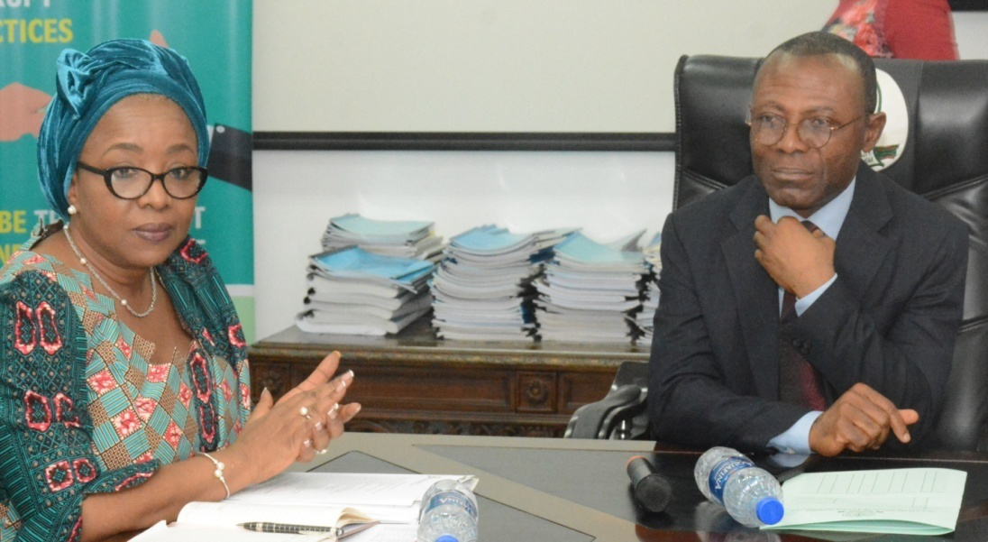 R-L: THE AUDITOR-GENERAL FOR THE FEDERATION (AuGF), ANTHONY MKPE AYINE (FCA) AND THE EXECUTIVE SECRETARY OF PENSION TRANSITIONAL ARRANGEMENT DIRECTORATE (PTAD), SHARON IKEAZOR, DURING A COURTESY VISIT TO THE AUDIT HOUSE ON WEDNESDAY 17TH, April 18, 2019.