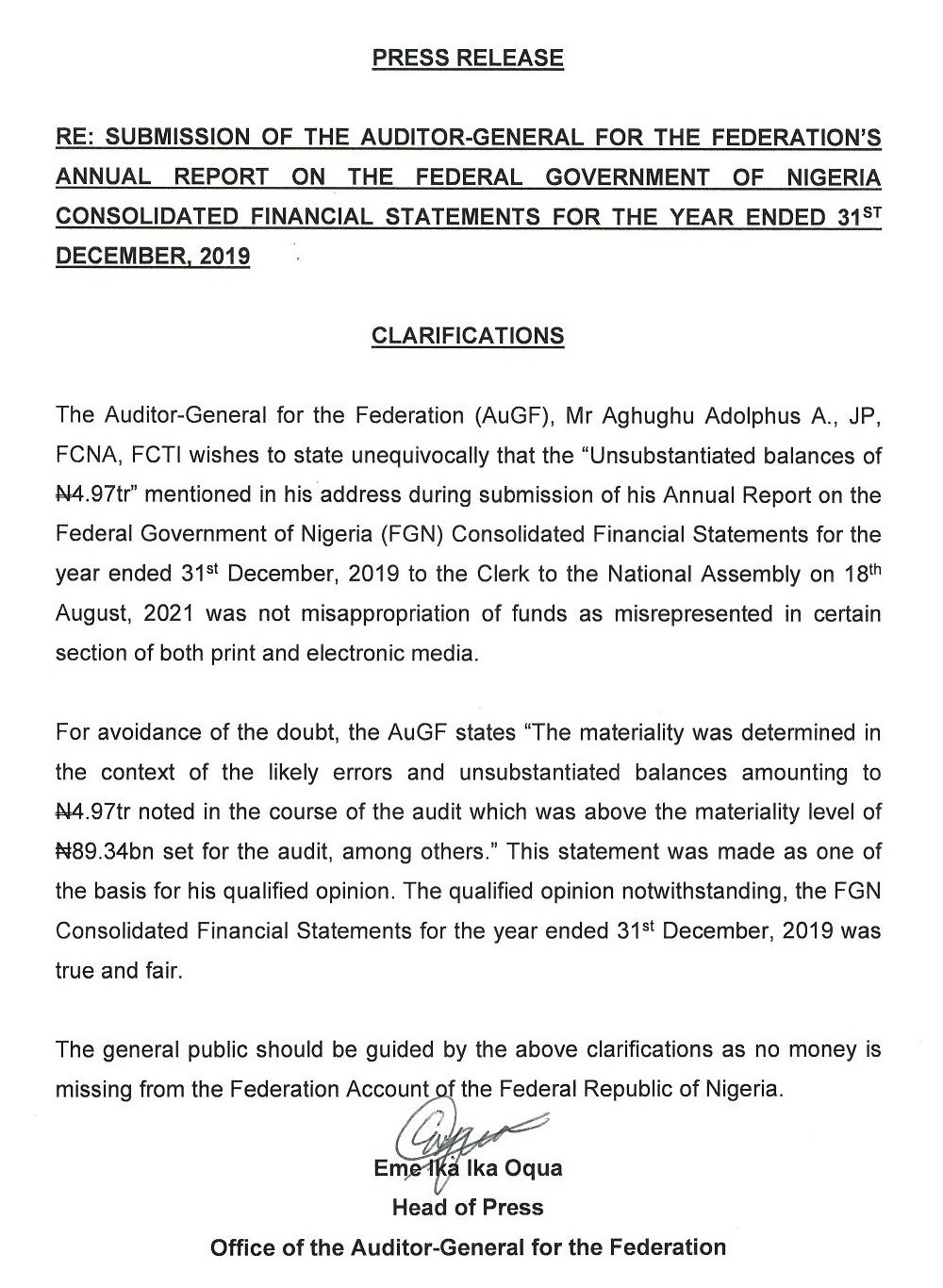 RE: SUBMISSION OF THE AUDITOR-GENERAL FOR THE FEDERATION'S ANNUAL REPORT ON THE FEDERAL GOVERNMENT OF NIGERIA CONSOLIDATED FINANCIAL STATEMENTS FOR THE YEAR ENDED 31ST DECEMBER, 2019 Print Email